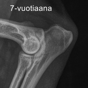 Kuvautin Entsyymin nivelet uudestaan hammaskivenpoiston yhteydessä. Kuvien välissä on kulunut neljä vuotta. Uudet kuvat näyttivät aika lailla samoilta kuin aikaisemmat, joten muutokset eivät ole edenneet nivelrikoksi. Päivitys: uusi kontrollikuvaus 7 v 10 kk iässä, samalta näyttää edelleen.