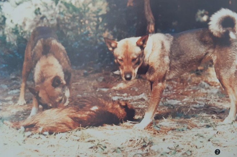 Oikeanpuoleisen nartun kuvateksti alkaa 土佐 (tekstiä luetaan takaperin) eli se on ehkä tosakoira, nykyisen shikokunkoiran edeltäjä.