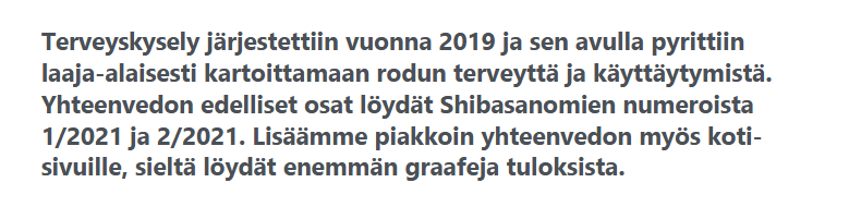 Sitten kun linkitin blogin shibojen kärpäspelkoa koskevan kyselyn (anonyymin, GDPR-turvallisen kyselyn) yhdistyksen ryhmään, niin tulivat erikseen kommentoimaan, että tämä ei sitten liity mitenkään yhdistykseen. Okei? Myöhemmin Kennelliitto teki siitä artikkelin Koiramme-lehteen. Tuntui hullulta joutua oikaisemaan toimittajan väärinkäsitys, että shibayhdistyksen aktiivisuudella olisi ollu sen kanssa jotain tekemistä mutta okei. Uusi JTO näyttää minusta olevan enemmän suljetun kaupallisen alapopulaation JTO eikä sisäsiittoisuudessaan uhatun rodun JTO. Sorry randomavautuminen, mutta luento avasi silmiä. Mielestäni shibanomistajilla on oikeus tietää poikkeavasta toiminnasta ja sen tiedon valossa itse päättää, haluavatko jatkossa osallistua jos/kun samat tekijät ja tekemättä jättäjät siellä on asialla.