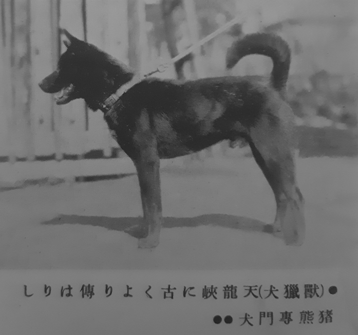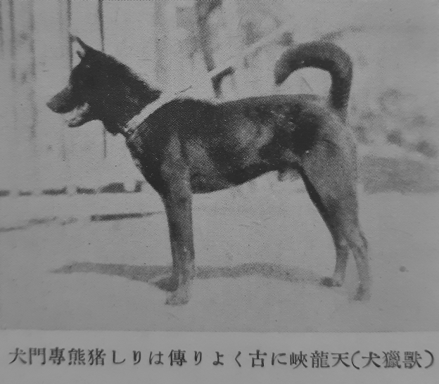 Metsästyskoira (erikoistunut villisikojen ja karhujen metsästykseen, peräisin muinaisista ajoista Tenryū-rotkosta). Tässä näkyy Takahisan myöhemmin käyttämästä nihonkenluokittelusta tuo 獸獵犬 eli ’pedonmetsästyskoira’. Suurriistakoira?