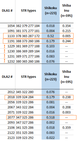 Shikokujen lukemat. DLA I -geeni: 8 erilaista havaittu, DLA II -geeni: 10 erilaista havaittu. Mutta näissä sama ilmiö kuin edellisissä markkereissa, eli suurimmalla osalla shikokuista on samat yleisimmät. Yleisin on kombo 1133 (DLA I)/2077 (DLA II) ja toiseksi yleisin 1191/2018. Näiden yleisyyslukemat on 52% ja 18%, respektiivisesti. En ole varma, miksi tässä frekvenssit ilmaistaan prosentteina. Mun mielestä kyseessä on yhä havaittu yleisyys kaikkien koirien geenipaikoissa (joita on yhteensä 2 x testattujen koirien lukumäärä).