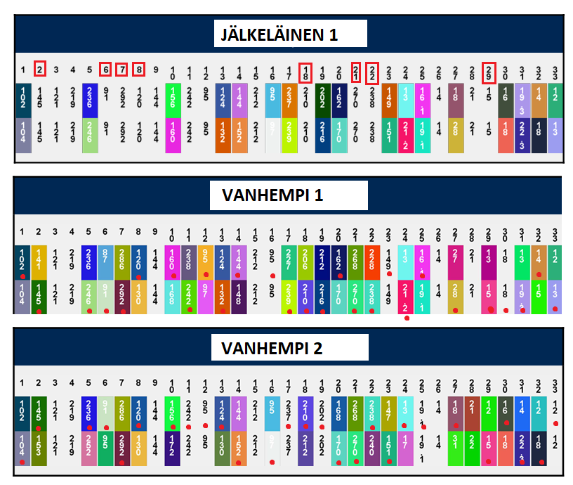 Noita erilaisia ei todellakaan löytynyt rodusta tasaisia määriä. Päinvastoin, kymmenen markkerin kohdalla jonkun yksittäisen markkeriversion yleisyyslukema on ollut välillä 0.7-0.9, kun lukema 1 tarkottaisi, että kaikilla koirilla rodussa olisi pelkästään sitä.